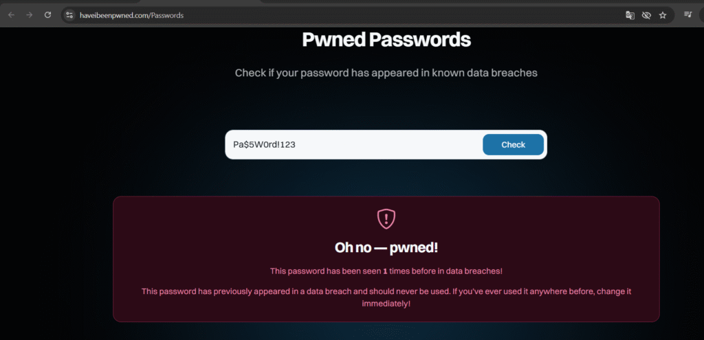 Y cuando se trata de contraseñas, también podemos verificar si fueron filtradas. De ser así, atacantes con los recursos suficientes dispondrían de estos listados de contraseñas para realizar ataques de fuerza bruta: